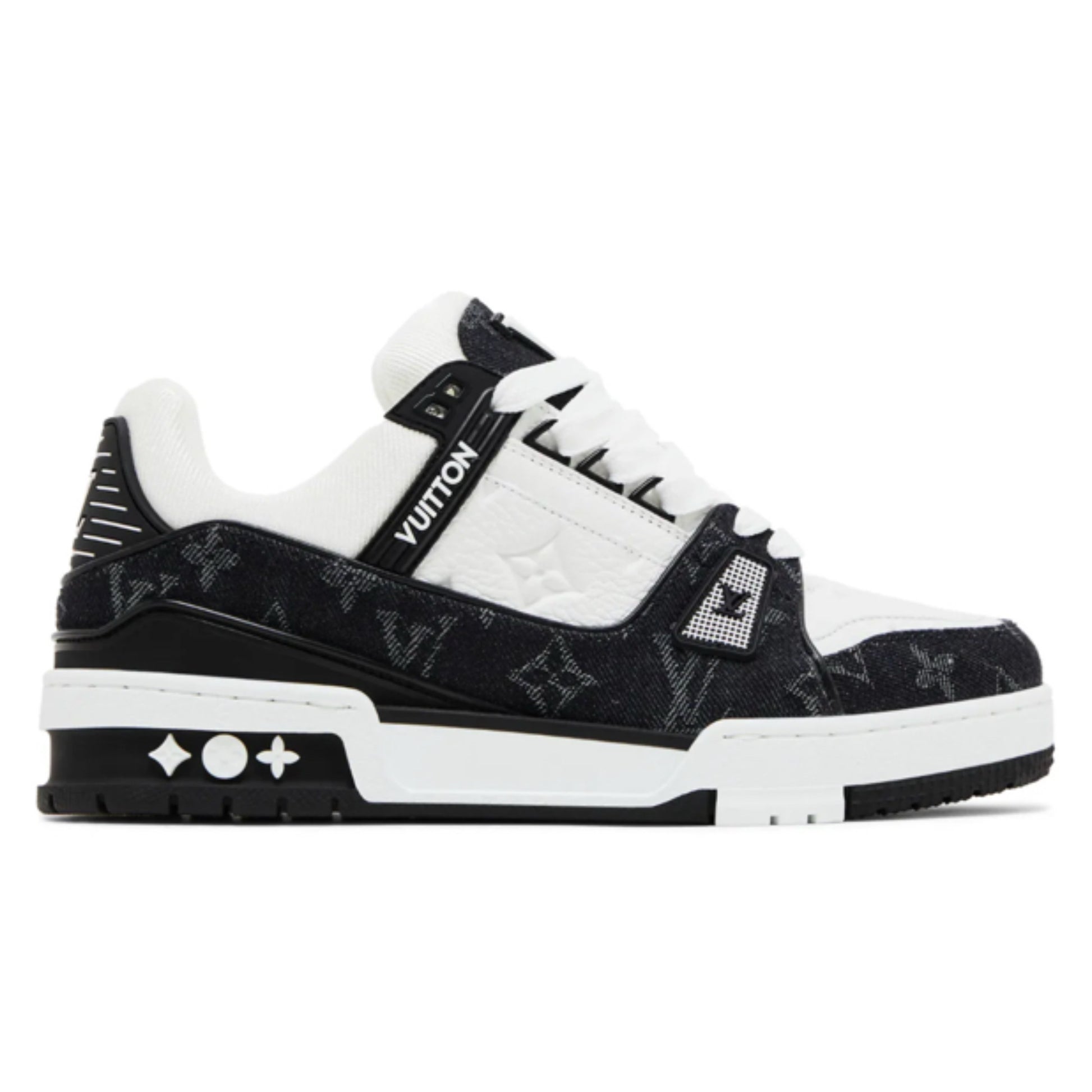 Conçue à l'origine par Virgil Abloh, cette sneaker LVT Trainer emblématique s'habille d'un mélange de denim Monogram et de cuir de veau grainé embossé du motif Monogram. Elle se distingue par sa tige au montage élaboré et ses nombreuses signatures, notamment les LV Initiales sur la languette et le talon, ainsi que les fleurs de Monogram sur la semelle en gomme technique.